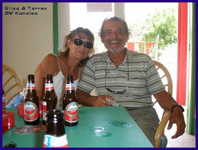 The buoys are in pairs (port & starboard) which makes picking them up a tad tricky.  No problem as it turned out.  Bouncing across the waves in his little Zodiac comes Yves from Imagine to pick up the mooring lines and hand them to Lindy, easy peasy.  Only I misjudge it, and slowly fall away to leeward leaving Yves standing in his dinghy holding a mooring buoy in each hand and grinning.  I come in faster next time and duly ram him (Ha.  That'll teach him to grin at me!)  No problem, he's still grinning and miraculously still holding both buoys!  In a few more minutes we're tied up and receiving a potted island guide from Yves in very broken Spanish (trust me his English is worse).  He has been here for several days and seems to have discovered where everything is, but has so far failed in a very Gallic way to trouble either immigration or customs.  "No problem, we'll all go together tomorrow."  And then he's off.  He's spotted Kanaloa arriving and he's off to help them with their lines as well.