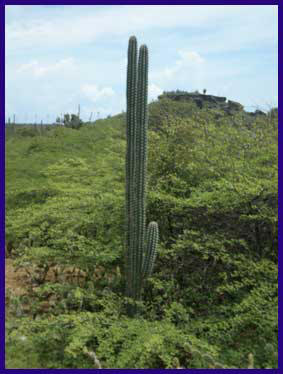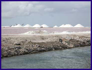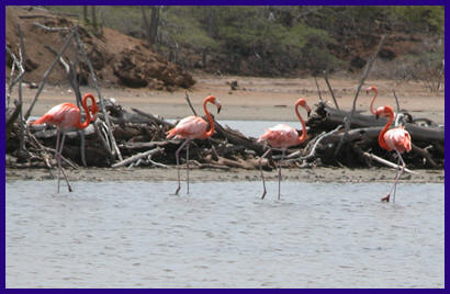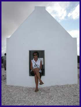 We spend the next days just relaxing, sitting in waterfront bars or restaurants.  So different from the last 9 months in Venezuela.  Then the 6 of us hire a car for a day to tour the island.  We quickly discover that a day is all it takes.  We do the salt pans, slave huts and flamingos.  That's the south of the island covered.  Then we head for Rincon, Bonaire's second city (actually village).  Rincon has a restaurant which is in the guide, but it's closed.  We find another (actually the other) bar/restaurant.  We ask what they have to eat.  The lady behind the bar eyes us uncomfortably.  Turns out it's a quantity issue.  No matter which way you cut it she can't come up with enough dishes to serve 6 people.  Tourists just don't come to Rincon.  In reality, tourists in Bonaire don't really move far away from the dive sites.
