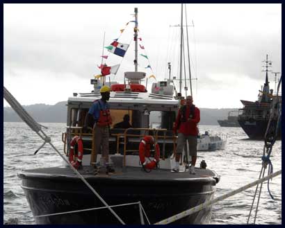 Repair ring pull, put on shoes(!) and off we sail for Porvenir.  About ten miles before we arrive we hook the biggest Barracuda in the universe.  Nearly an hour later we have it alongside the boat.  Or we're alongside it.  Did I mention it was big?  Just as the two of us are trying  to heave it on board the line snaps.  The 80lb line!  So we lost fish, hook, lure, the lot!  It was as Barry fell backwards that his shoe fell off into the sea!!