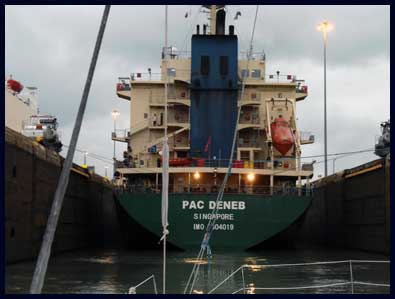 Gatun the first three locks that will lift us up 26 meters into the Gatun lake where we will spend the night and wait for a new advisor in the morning.  We're all a little tense.  We've read how to do this.  We've also read about all the possible disasters for small vessels - most of which boil down to incompetence aboard the vessel in question.  Please let me not be the one!  But in the event it goes very smoothly.  We raft to Kaitlyn and move slowly into the lock towards the stern of a very, very, big container vessel.