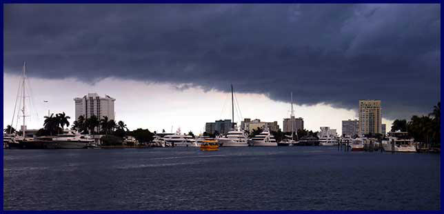 Fort Lauderdale is a Class A inlet ie big ships/any weather, so no problems there.  Getting from the entrance to the moorings will be our first encounter with the Intracoastal Waterway (ICW) and its bridges.  Only about 2 miles of its 3,000 mile length and only one bridge, but one small step......  The ICW runs just inside the coast from Norfolk, Virginia to the Florida keys with a spur running along the gulf coast to Texas.  An amazing thing, a navigable waterway, with a design controlling depth of 10ft along it's entire length and all bridges a minimum height of 65ft or opening (both at Mean Low Water).  Samarang draws 7ft and her height to the top of her lightning conductor is 64ft - so not a problem.  Except - Ah there's the rub!  Not all the bridges were quite built to spec (the most notorious being the Julia Tuttle bridge in Miami at 56ft).  Julia Tuttle, the mother of Miami, owned most of the land Miami was built on.  Don't know much more about her than that, but I'm assuming she had a fear of high places or higher than 56ft at least.  Also, not all the channel was ever quite dredged to 10ft and there's no longer the budget for the necessary dredging so many areas have silted up - south of Miami the controlling depth is now 5 ft.  Our 2 miles and 1 bridge should be a walk in the park, but even those bridges which have been built to spec, look pretty low as you approach them!  But of course it was OK and we spent the next week or so swinging on a mooring buoy outside Las Olas Marina with a full foot of water under our keel.  Certainly much more comfortable there than out at sea when those afternoon thunderstorms start rolling in!